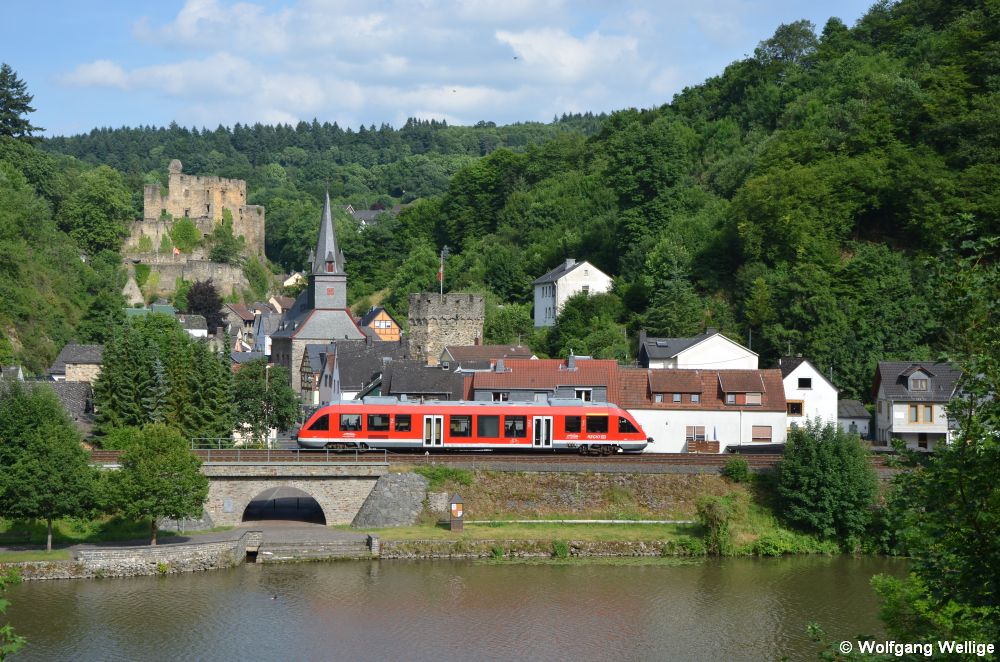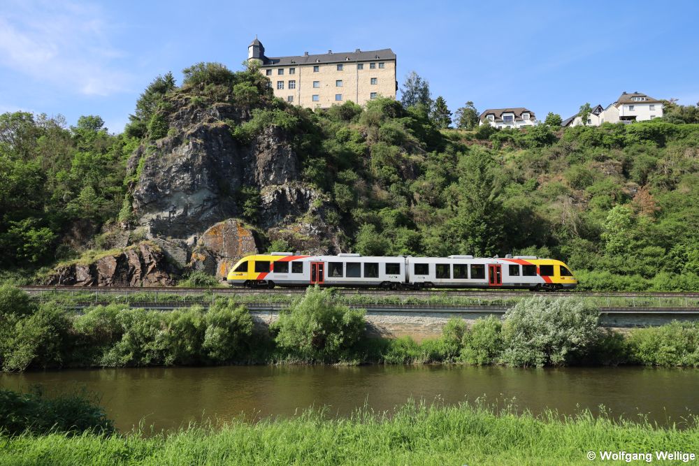 VT 288 der Hessischen Landesbahn ist am 10. Juni 2021 unterwegs auf der Lahntalbahn als RB 45 von Limburg über Gießen nach Fulda, aufgenommen in Runkel unterhalb der Burg Schadeck.