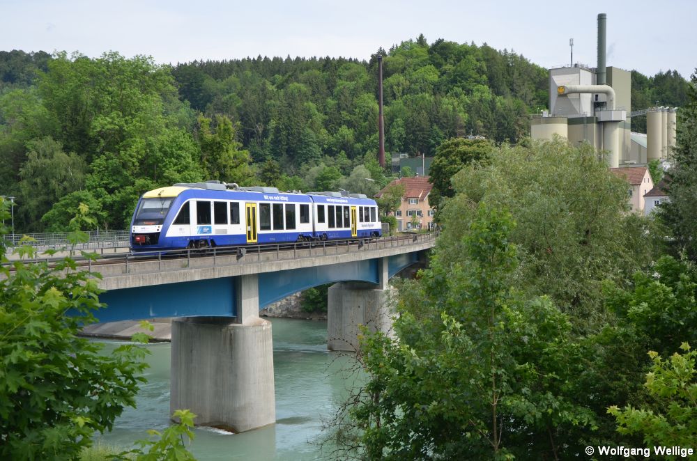 Der LINT-Triebwagen VT 219 der Bayerischen Regiobahn überquert am 9. Juni 2019 als BRB 86527 von Augsburg kurz vor seinem Endbahnhof Schongau den Lech