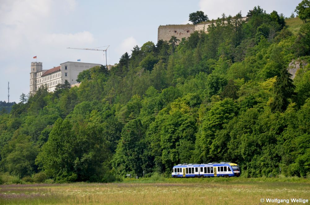 Unterhalb der Eichstätter Willibaldsburg rollt VT 213 der Bayerischen Regiobahn am 06.07.2013 als BRB 86748 nach Eichstätt Stadt