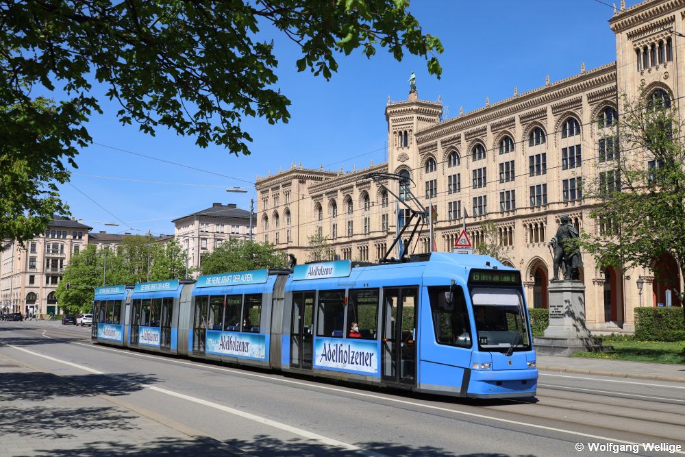 Die vierteiligen Fahrzeuge des Typs GT8N2, der in München als R 3.3 bezeichnet wird, wurden von ADtranz/Bombardier in den Jahren 1999-2001 gebaut. Am 18.04.2022 fährt Wagen 2214 zwischen den Haltestellen Kammerspiele und Maxmonument die repräsentative Maximilianstraße entlang.