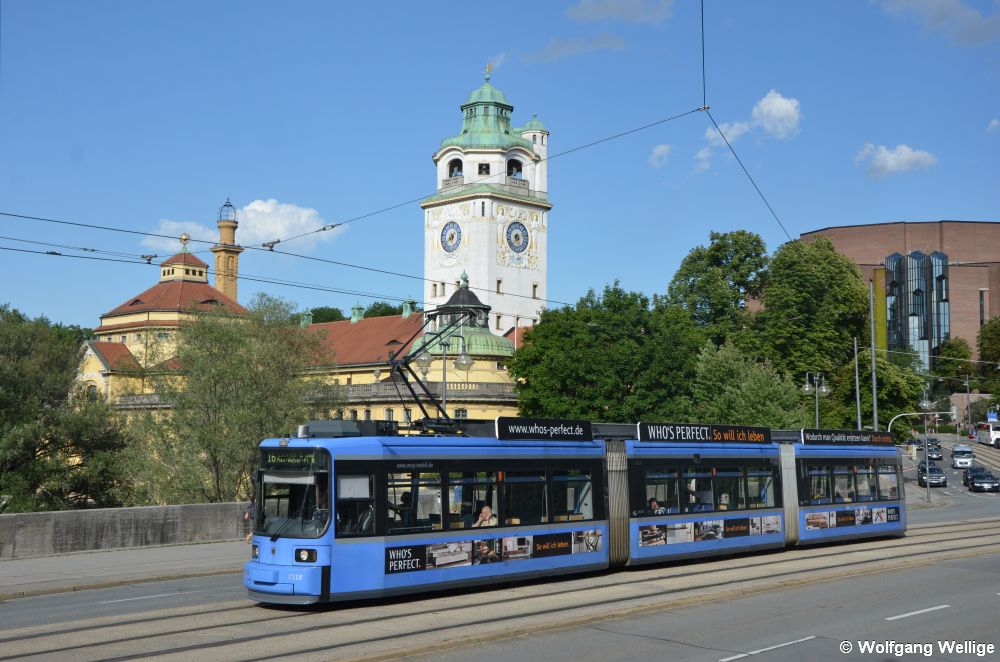 Vor der Kulisse von Müllerschem Volksbad (links) und Kulturzentrum Gasteig (rechts) überquert Wagen 2165 am 2. August 2014 nahe der Haltestelle Deutsches Museum die Isar