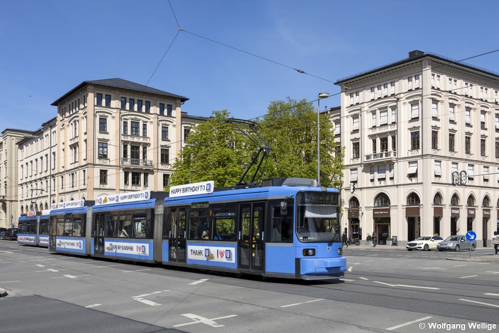 Der mit einer Werbung für das 50-jährige Jubiläum der Münchner U-Bahn versehene Wagen 2164 fährt am 18.04.2022 die Maximilianstraße entlang, aufgenommen kurz hinter der Haltestelle Kammerspiele.