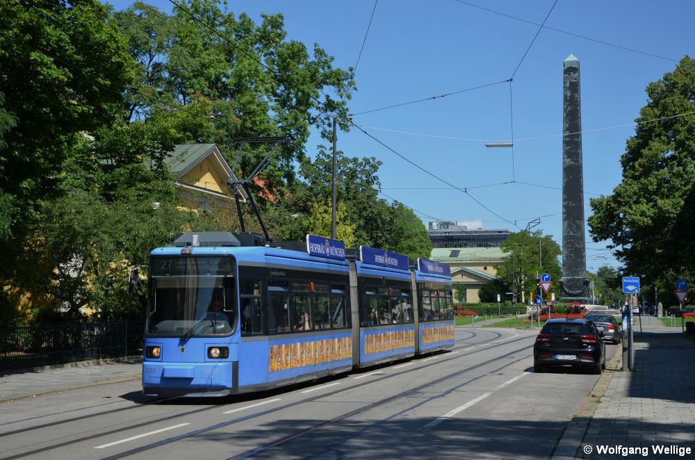 Der redesignte R2.2-Triebwagen Nummer 2151 fährt am 11.08.2019 auf die Haltestelle Ottostraße zu, im Hintergrund ist der Obelisk am Karolinenplatz zu sehen.