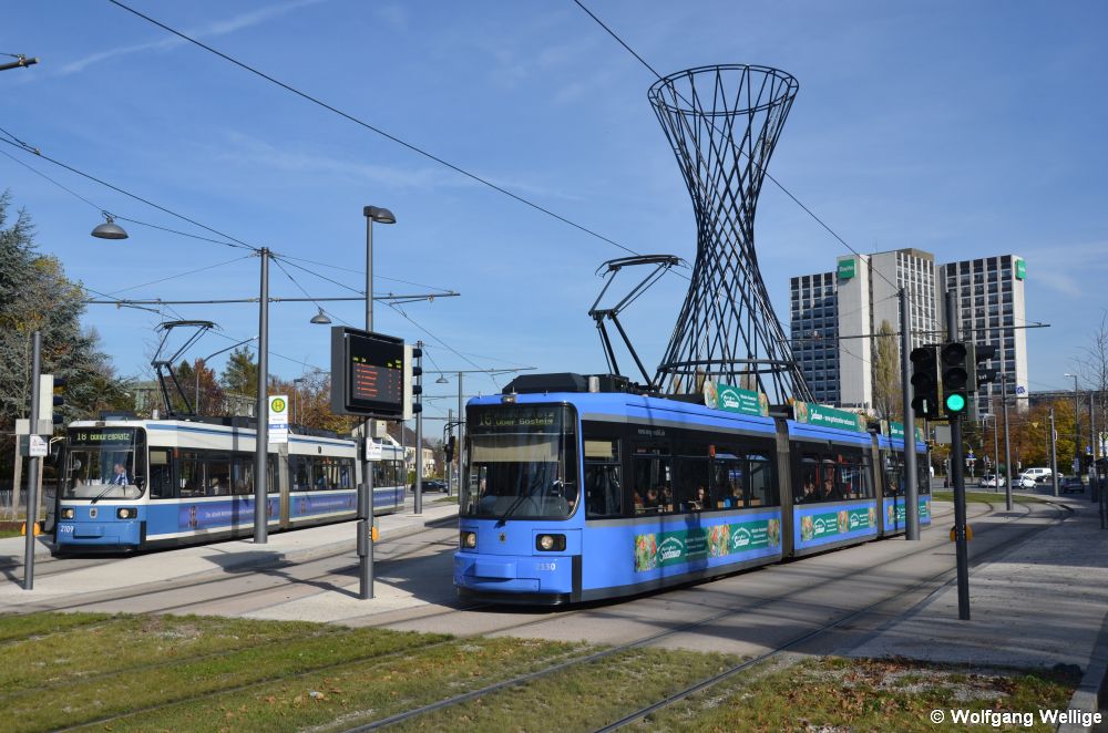 Der mit einer Ganzreklame beklebte Wagen 2501 fährt am 1.10.2023 in die Haltestelle Stiglmaierplatz mit dem markanten Turm des Löwenbräukellers im Hintergrund ein