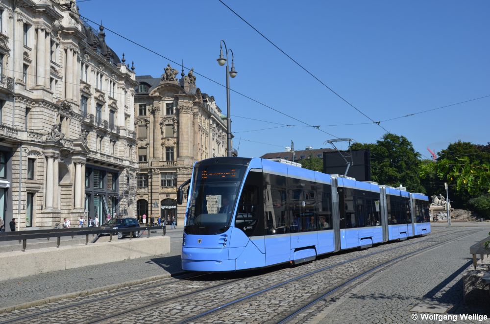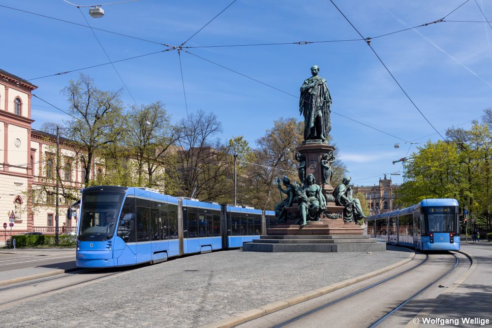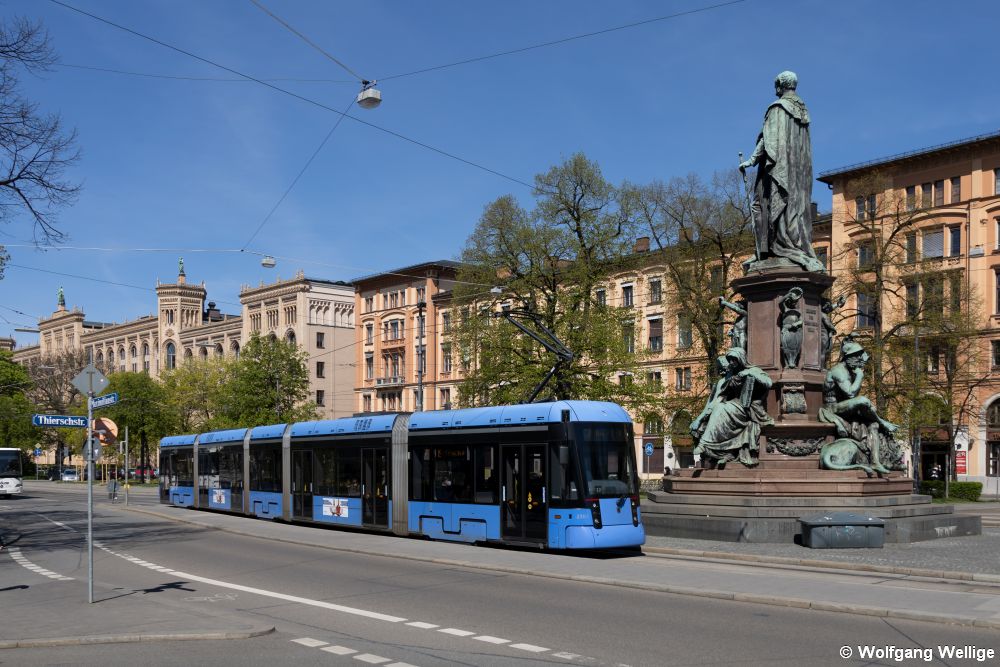 Der vierteilige 'Avenio TZ' 2558 wurde anlässlich des 150. Geburtstages der Münchner Tram in der Farbgebung verschiedener Baureihen der Münchner Tram gestaltet (A, M, R und hinten T). Am 7. März 2026 fährt er gerade auf die zentrale Haltestelle Karlsplatz (Stachus) zu.