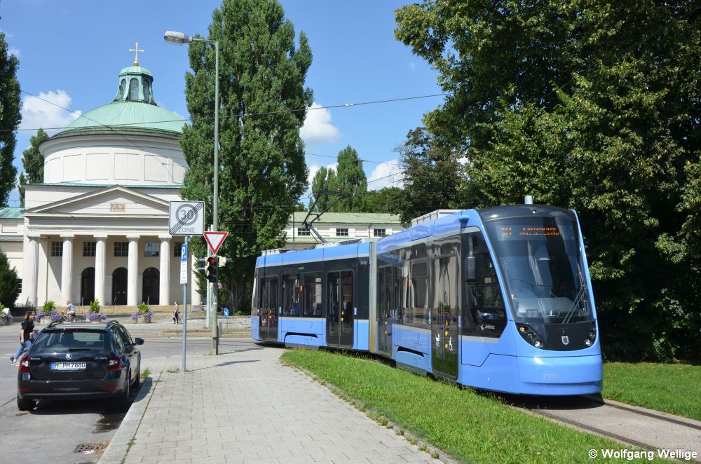 Während der Marktveranstaltung 'Auer Dult' fahren zusätzliche Züge zum St.-Martins-Platz. Auf einem dieser Kurse macht sich am 4. August 2019 der zweiteilige 'Avenio' 2705 nützlich, hier bei der Wendefahrt vor der Aussegnungshalle des Ostfriedhofs.