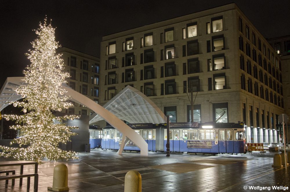 Am 9.12.2018 ist zur Eröffnung der Haltestelle 'Schwabinger Tor' P-Wagen 2006 ausnahmsweise auf der Linie 23 im Einsatz. Bei der abendlichen letzten Fahrt ist die Haltestelle menschenleer, als die Aufname mit dem Weihnachtsbaum an der jüngsten Station des Münchner Trambahnnetzes entstand.