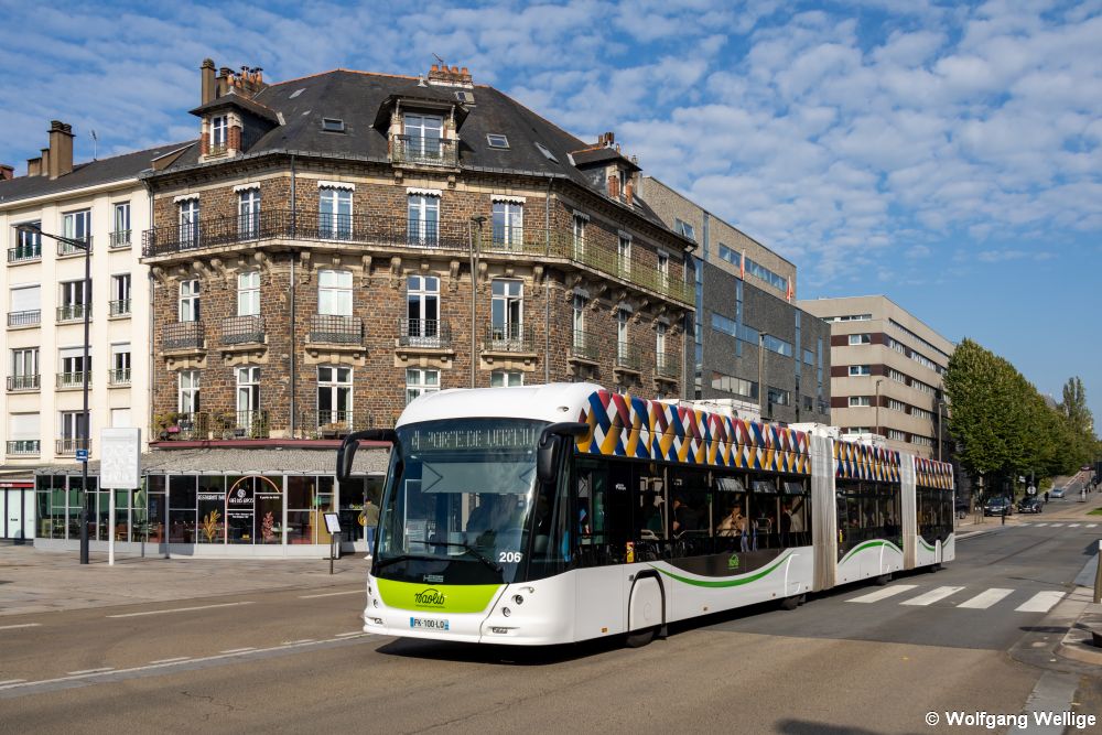 Die Linie 4 ist eine Expressbuslinie, die straßenbahnähnlich auf einem großzügig angelegten, eigenen Planum unterwegs ist. Am 20.09.2024 hat der von Hess produzierte Doppelgelenkbus Nummer 206 auf der als 'BusWay' bezeichneten Linie gerade die Haltestelle Cité de Congès verlassen.