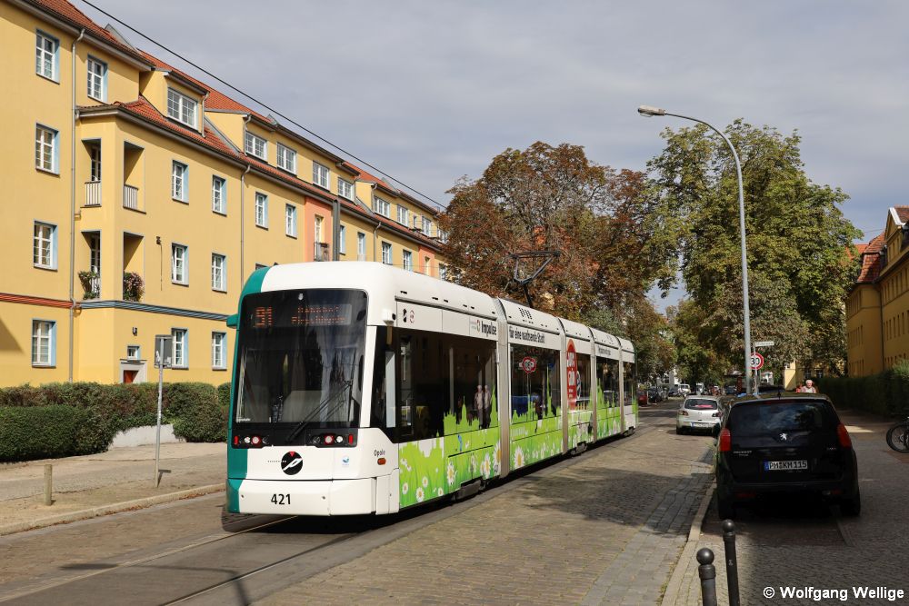 Variobahn 421 fährt am 8. September 2020 auf die Haltestelle Kastanienallee / Zeppelinstraße zu. Die Bahnen fahren hier stadteinwärts und -auswärts jeweils eingleisig durch verschiedene Straßen.