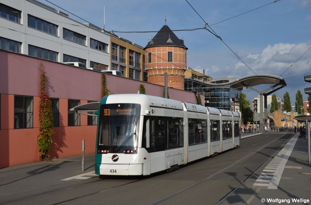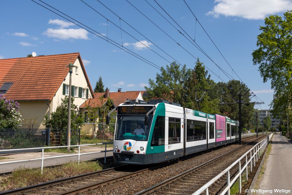Der nachträglich auf sieben Wagenteile verlängerte Combino 415 hat am 13.05.2023 gerade die Haltestelle Turmstraße hinter sich gelassen. Die ergänzten Segmente sind an den höheren Dächern zu erkennen.