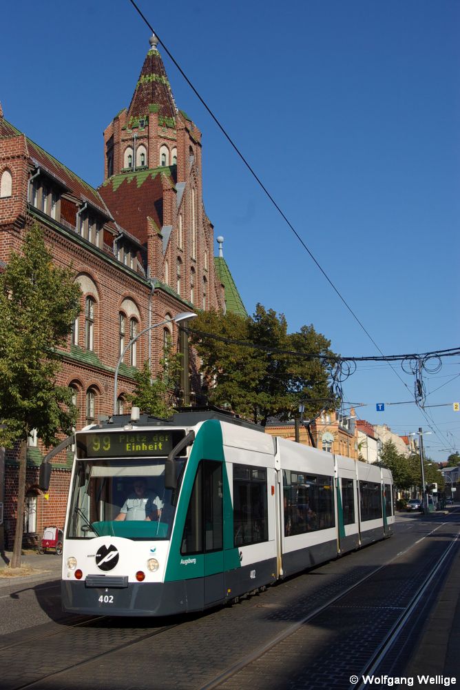 Combino Nummer 402 fährt am 20.08.2009 vor dem Rathaus Babelsberg kurz hinter der gleichnamigen Haltestelle entlang