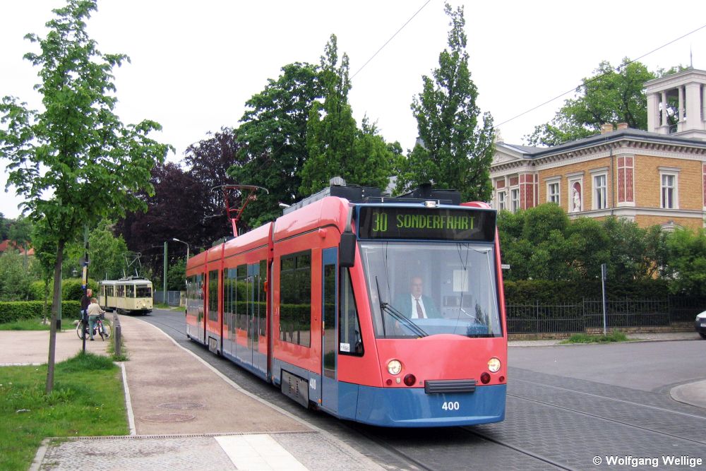 Im Mai 2005 war der Combino-Prototyp noch nicht für den Linieneinsatz umgebaut und trug noch seine ursprügliche Vorführlackierung, hier beim Fahrzeugkorso '125 Jahre Straßenbahn in Potsdam' am 22.05.2005 an der Puschkinallee.