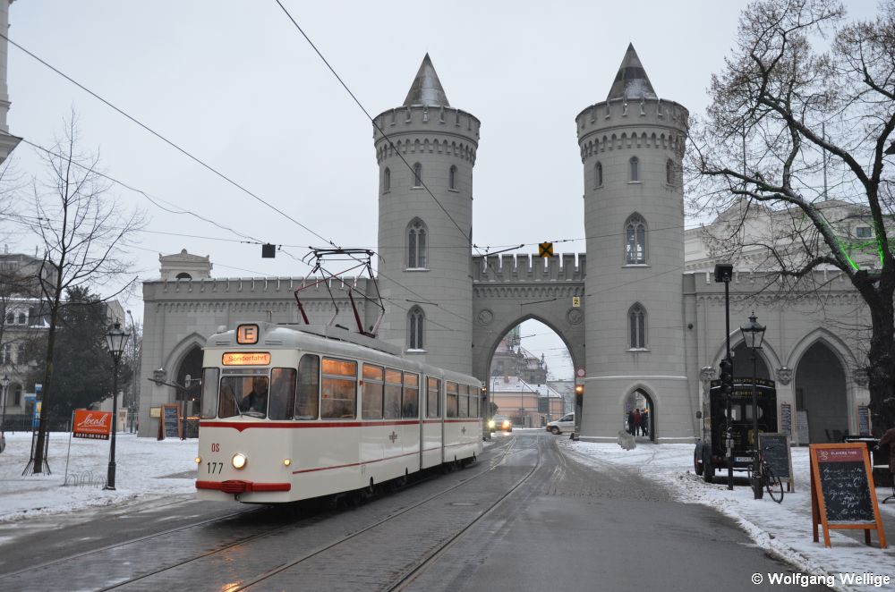 Der vom VEB Waggonbau Gotha gefertigte 'Gothaer Gelenkwagen' 177 zählt zur betriebsfähigen Museumsfahrzeugflotte des Potsdamer Verkehrsbetriebes. Am 27.01.2013 hat das Fahrzeug auf einer Sonderfahrt gerade das Nauener Tor durchfahren.
