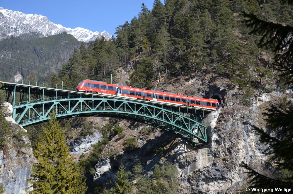 2442 204 taucht am 8. März 2014 als RB 5416 (Innsbruck Hbf - München Hbf) aus dem 720 Meter langen Schlossbachtunnel auf und rollt über die 60 Meter hohe Schlossbachbrücke zwischen Hochzirl und Leithen in Tirol