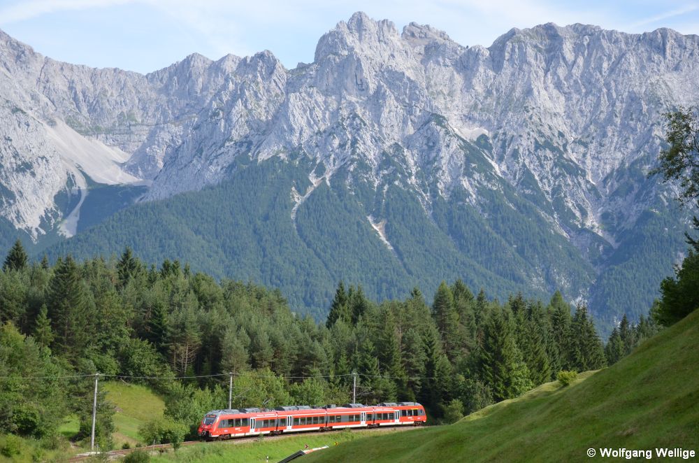 Vor der stattlichen Kulisse des Karwendelgebirges fährt Talent 2-Triebwagen 2442 213 am 17.08.2014 bei Klais als RB 5422 von Seefeld in Tirol nach München
