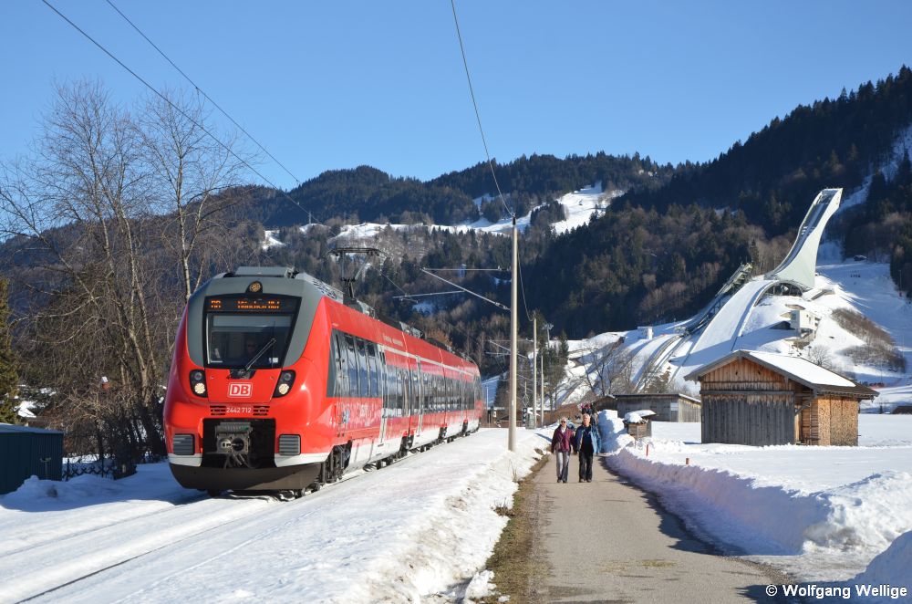 Bei schönstem Winterwetter zeigt sich Talent-Triebwagen 2442 212 am 15. Februar 2019 als RB 59476 von Mittenwald nach München vor der Skisprungschanze in Garmisch-Partenkirchen