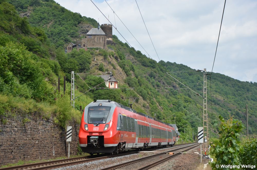 Als RB 81 von Koblenz nach Trier fährt 'Hamsterbacke' 442 206 am 23. Juni 2017 die Moselstrecke entlang, aufgenommen unterhalb der Burg Bischofstein zwischen Hatzenport und Moselkern.