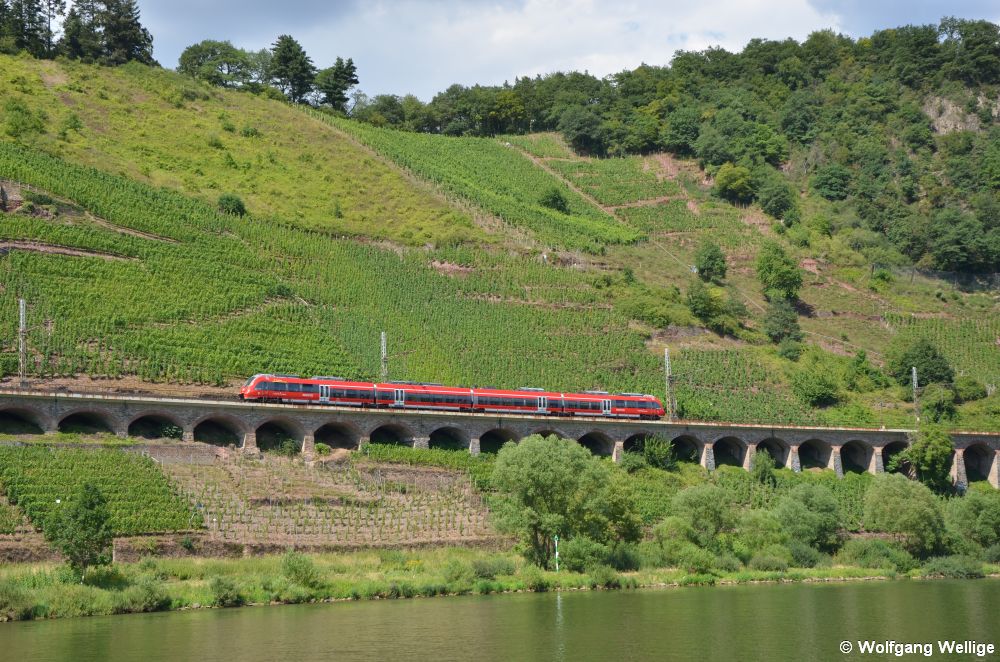 Talent 2-Triebwagen 442 203 befährt am 26. Juli 2018 als RB 81 von Koblenz nach Trier den bekannten Pündericher Hangviadukt bei Bullay