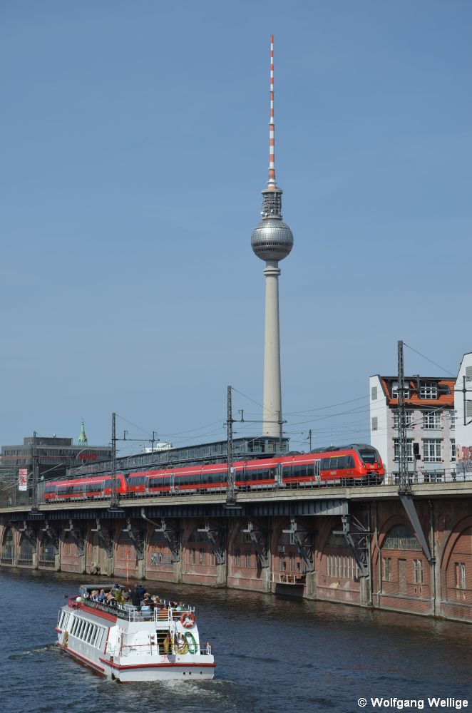442 323 begegnet am 21. April 2013 als RB 18919 Nauen von nach Berlin-Schönefeld Flughafen auf der Berliner Stadtbahn an der Jannowitzbrücke einem Ausflugsboot auf der Spree