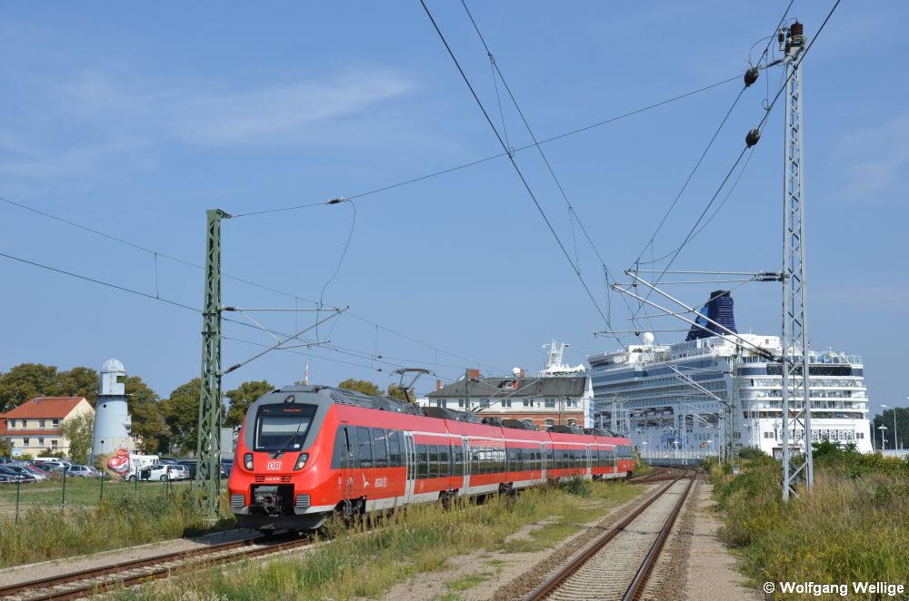 Mit Leuchtturm und einem Kreuzfahrtschiff im Rücken erreicht der Talent 2-Triebwagen 442 338 auf der Rostocker S-Bahnlinie S3 (Warnemünde - Rostock Hbf - Güstrow) am 5. September 2014 gleich die Station Warnemünde Werft