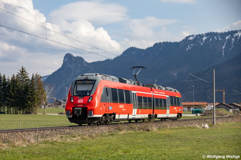 Der zweiteilige Talent 2-Triebwagen 442 010 pendelt am 28. April 2021 auf der Nebenbahn Murnau - Oberammergau, die Aufnahme entstand bei Unterammergau.