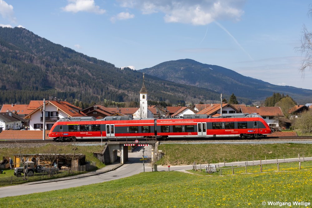 'Baby-Talent' 442 010 ist am 28. April 2021 vor der Kulisse von Altenau (Bayern) als RB 63 auf dem Weg von Oberammergau nach Murnau"