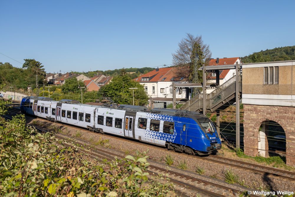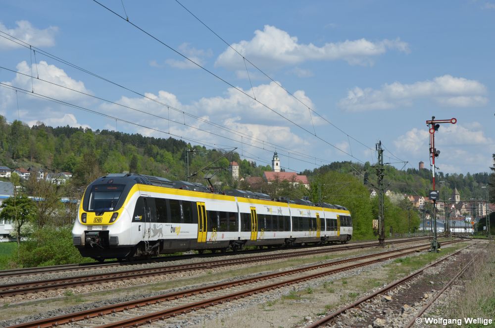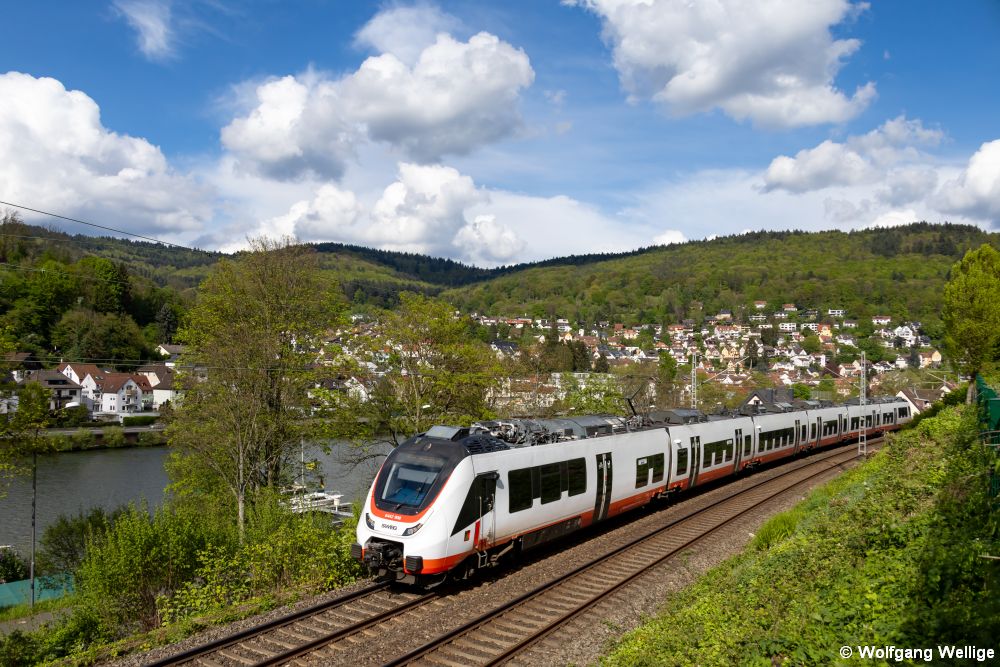 Der eigentlich für Österreich gebaute, aber von den ÖBB nicht abgenommene 'Talent 3' 6442 408 wurde vom Hersteller an die SWEG vermietet. Am 17.04.2024 fährt er er als RE 10a durchs Neckartal, aufgenommen bei Heidelberg-Schlierbach/Ziegelhausen.