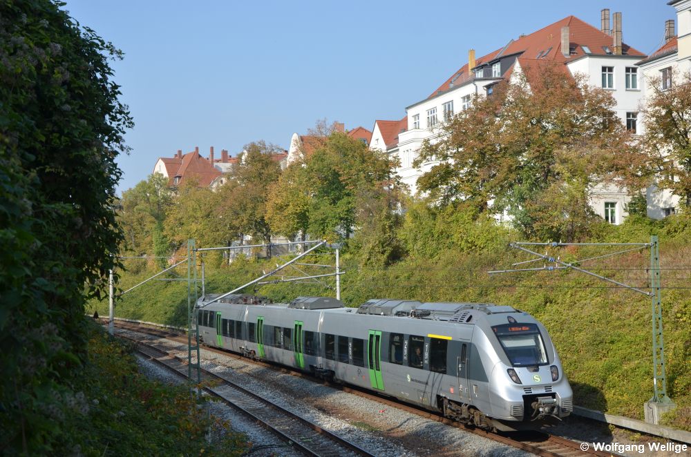 Der Talent 2-Triebzug 1441 121 der 'S-Bahn Mitteldeutschland', die im Raum Leipzig/Halle verkehrt, ist am 17.10.2018 als Linie S1 unterwegs von Leipzig-Stötteritz nach Leipzig Miltitzer Allee, aufgenommen nahe dem Haltepunkt Leipzig Coppiplatz.