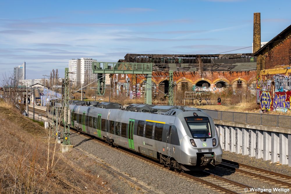 1442 210 der S-Bahn Mitteldeutschland fährt am 26.03.2022 kurz hinter dem Haltepunkt Leipzig MDR am verlassenen Ringlokschuppen des ehemaligen Betriebswerkes Bayerischer Bahnhof