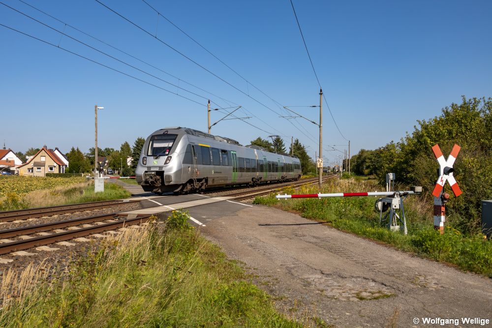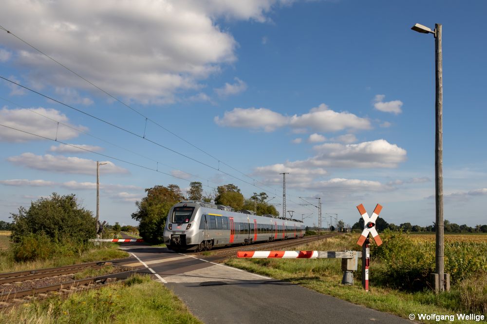 1442 119 der S-Bahn Mitteldeutschland passiert am 10.09.2023 als Linie S4 von Falkenberg (Elster) über Leipzig nach Markkleeberg-Gaschwitz einen kleinen Bahnübergang mit alter Sicherungstechnik bei Mockrehna