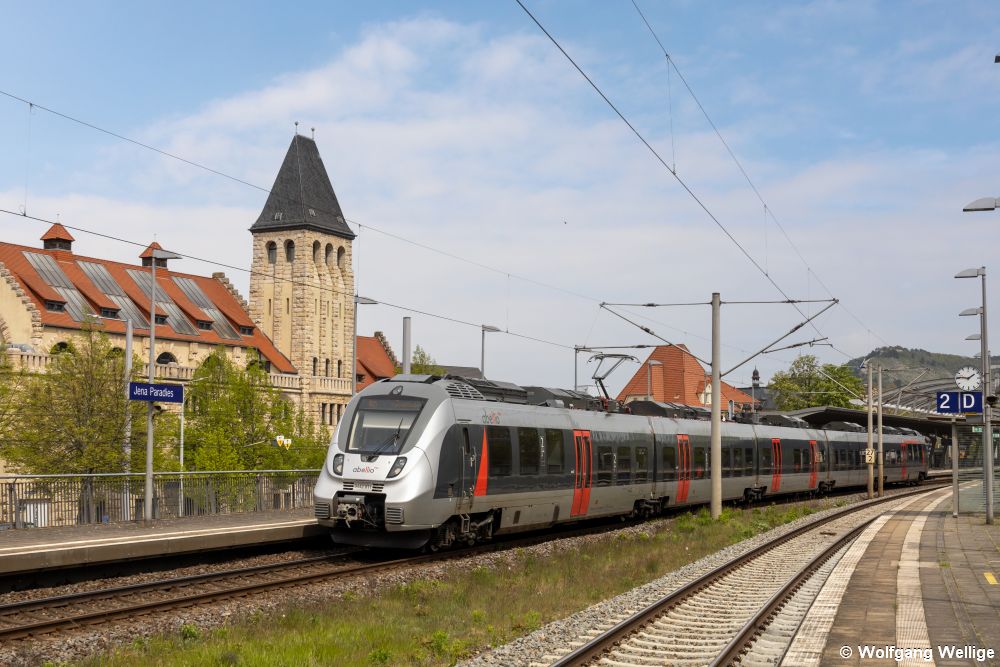 Talent 2-Triebwagen 9442 311 von Abellio legt am 4. Mai 2023 als RB 25 von Halle nach Saalfeld einen Stopp im Bahnhof Jena Paradies ein. Der Turm im Hintergrund gehört zum ehemaligen Volksbad, das heute ein Veranstaltungszentrum beherbergt.