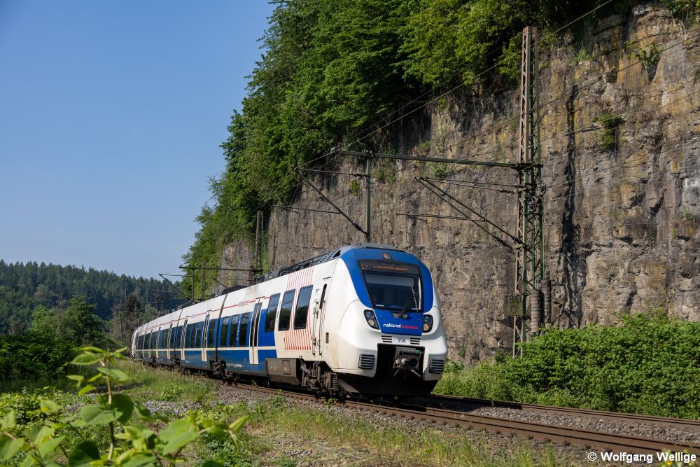 Talent 2-Triebzug 442 356 des Betreibers NationalExpress ist am 11. Juni 2021 als RE 7 auf dem Weg von Krefeld nach Schwerte (Ruhr), aufgenommen an der Felswand bei Ennepetal.