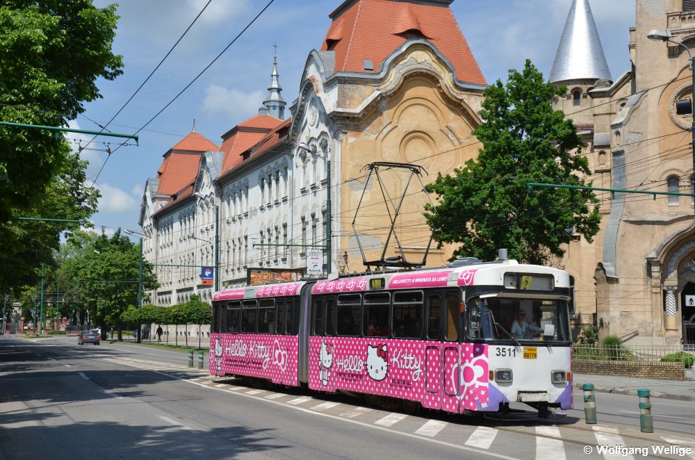 Der ebenfalls aus Bremen stammende Wagen 3512, ein GT4e der Firma Wegmann, fährt am 2. Mai 2014 mit einer etwas gewöhnungsbedürftigen Vollwerbung versehen als Linie 2 auf die Haltestelle Catedrala Mitropolitană zu