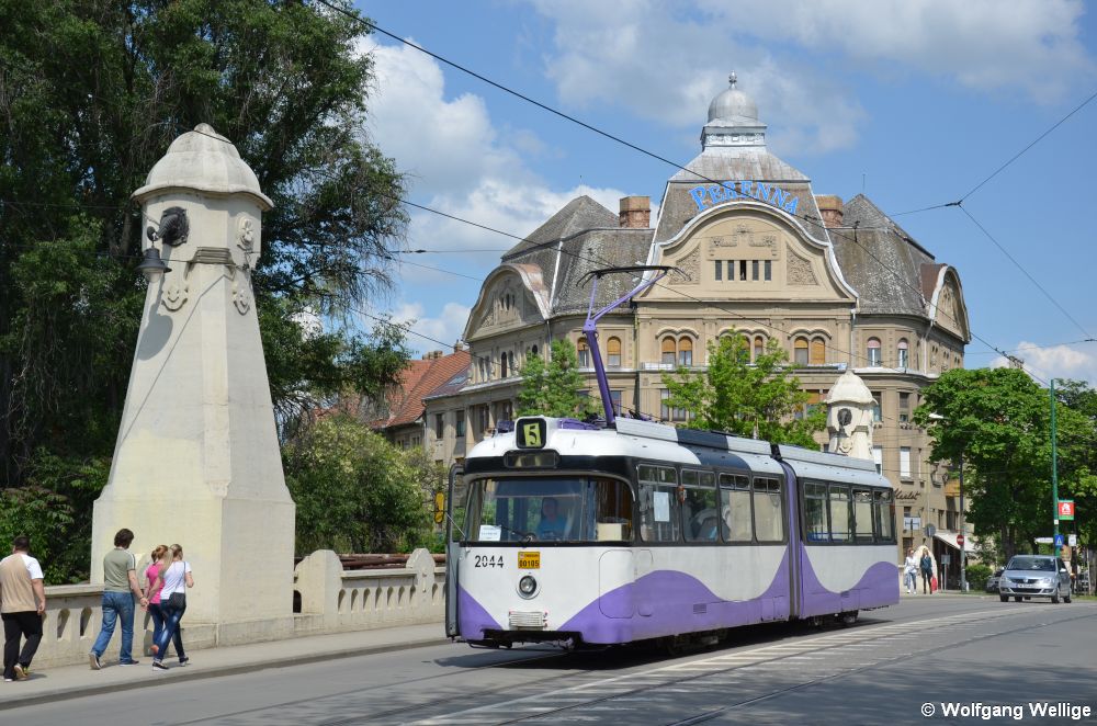 Solo-P-Wagen waren in in ihrer früheren Heimat München eine Ausnahme, in Temeschwar aber völlig normal: Wagen 2044 als Linie 5 auf der Brücke über den Fluss Bega vor der Haltestelle Prefectură (02.05.2014)