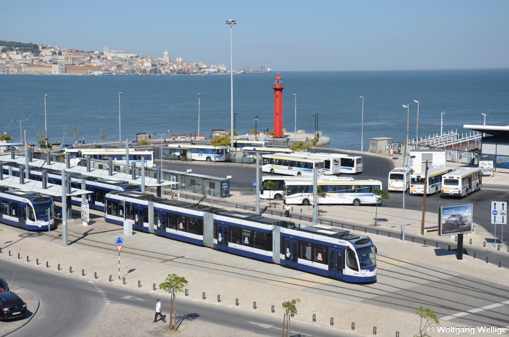 Wagen C022 verlässt die direkt am Schiffsanleger gelegene Endhaltestelle Cacilhas, wo zu den Fähren nach Lissabon umgestiegen werden kann (15.09.2012).