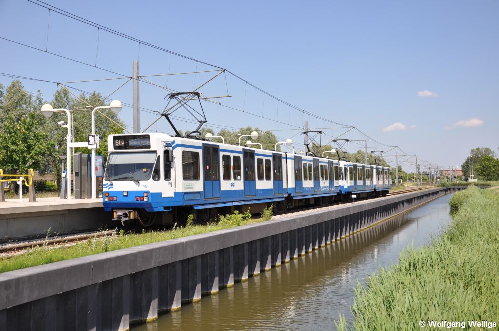 Metro-Wagen 45 steht am 30. Mai 2011 als Linie 51 in der Endstation Westwijk - diese Linie fuhr bis 2019 abschnittsweise im Mischbetrieb mit der Straßenbahn, daher hatten die Triebwagen zusätzlich zu den seitlichen auch Dachstromabnehmer (30.05.2011).