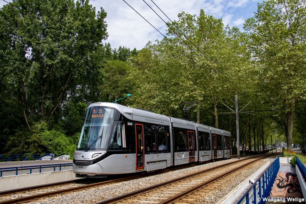 Die Schnelltram-Linie 25 ist eine ehemalige Metro-Linie, die 2019 für den Betrieb mit Niederflur-Straßenbahnen umgebaut wurde. Die die Strecke in die Region führt, tragen die hier eingesetzten Fahrzeuge das silbergraue 'R-Net'-Design statt der weiß-blauen Amsterdamer Farbgebung - so wie Wagen 3009, der am 17.06.2021 nahe der Haltestelle Van Boshuizenstraat unterwegs Richtung Westwijk ist.