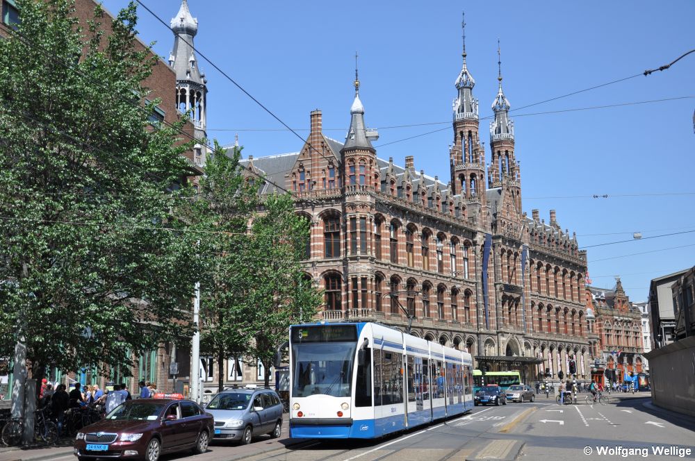 Vor dem Hauptbahnhof (Centraal Station) ist der im Jahre 2005 von Siemens gebaute 'Combino' Nummer 2150 am 1. Mai 2016 gerade zur Fahrt als Linie 26 nach Ijburg aufgebrochen