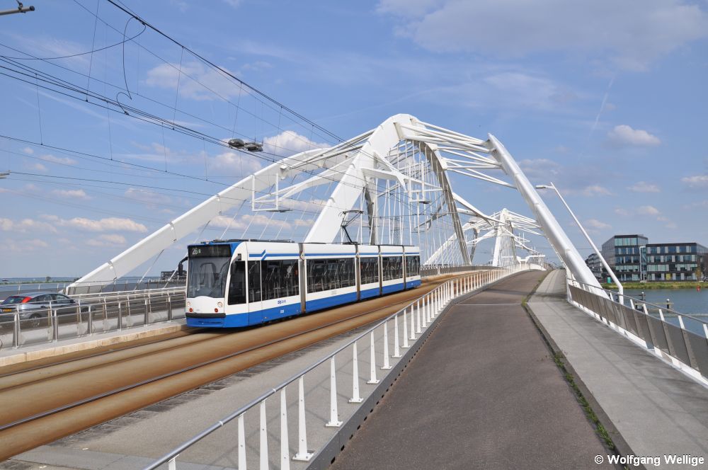 Wagen 2133 überquert am 30. Mai 2011 die Brücke 'Enneus Heermabrug' hinter der Haltestelle Steigereiland, die auf einer künstlich aufgespülten Sandinsel liegt.