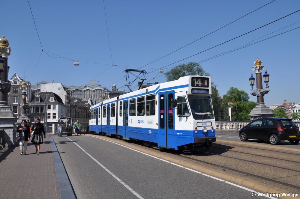 Seit 2015 nicht mehr im Einsatz sind die Fahrzeuge des 1979-80 gebauten Typs LHB 9G. Am 30.05.2011 überquert Wagen 786 die prachtvolle 'Blauwbrug' nahe der Haltestelle Waterlooplein.