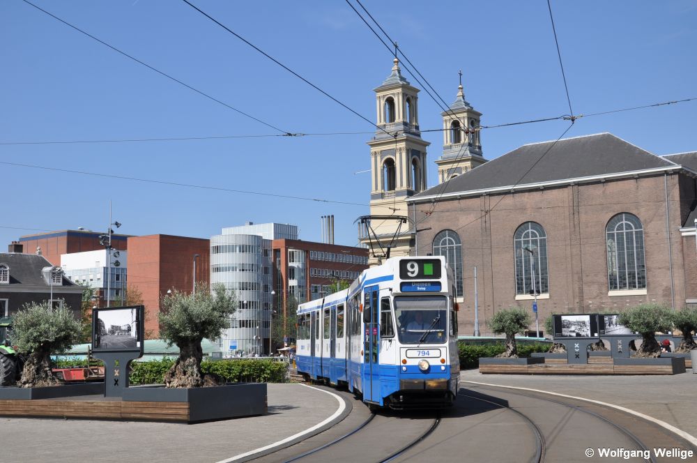 Wagen 794 erreicht am 30. Mai 2011 vor der Moses und Aaronkirche (Mozes en Aäronkerk) gleich die Haltestelle Meester Visserplein