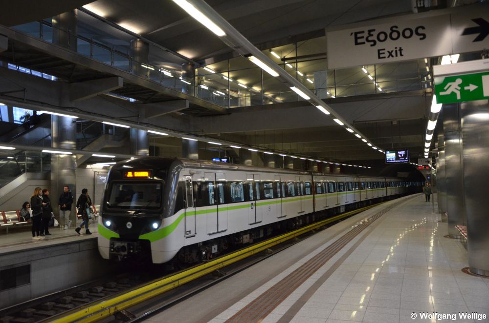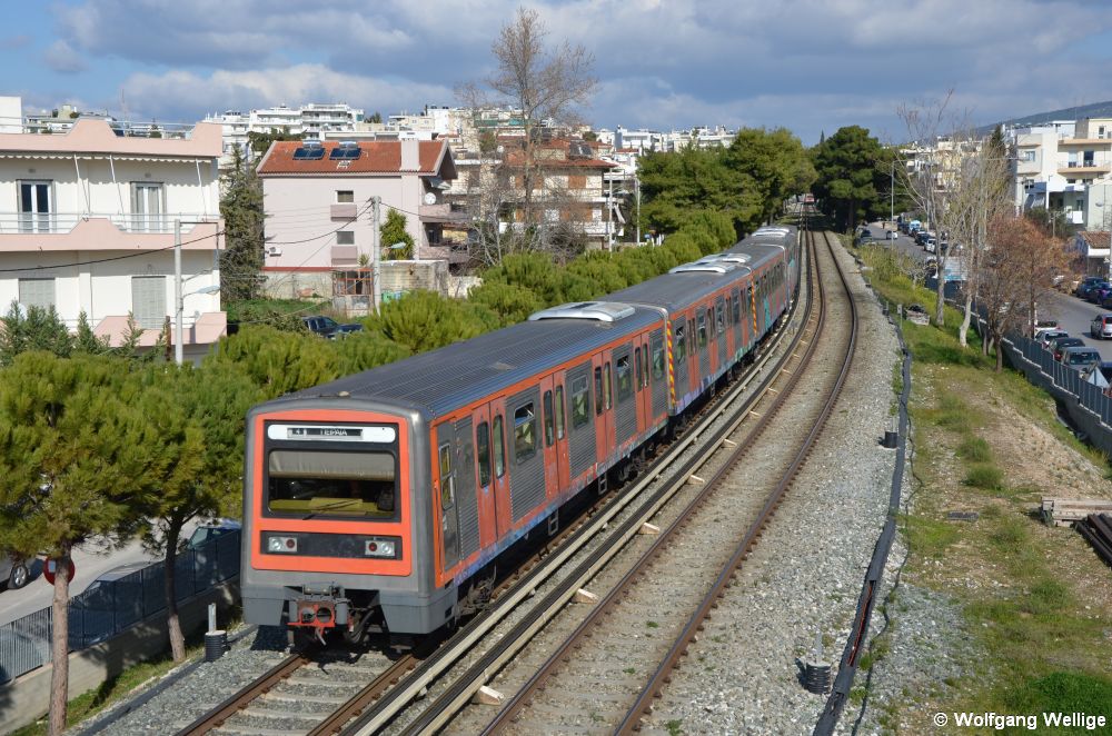 Alle 30 Minuten verkehrt eine Metro bis zum etwa 20 Kilometer von der Stadt enfernten Flughafen: Sie wechselt hierfür hinter der Station Doukissis Plakentias auf das Netz der griechischen Staatsbahn (OSE). Für diese Fahrten wurden sieben Zweisystem-Züge beschafft, die zusätzliche Dachstromabnehmer haben und mit 25 kV Wechselspannung betrieben werden können. Das Foto zeigt Zug 32 am 25.01.2016 kurz vor der auf dem Eisenbahnabschnitt gelegenen Station Peania-Kantza (Παιανία-Κάντζα).