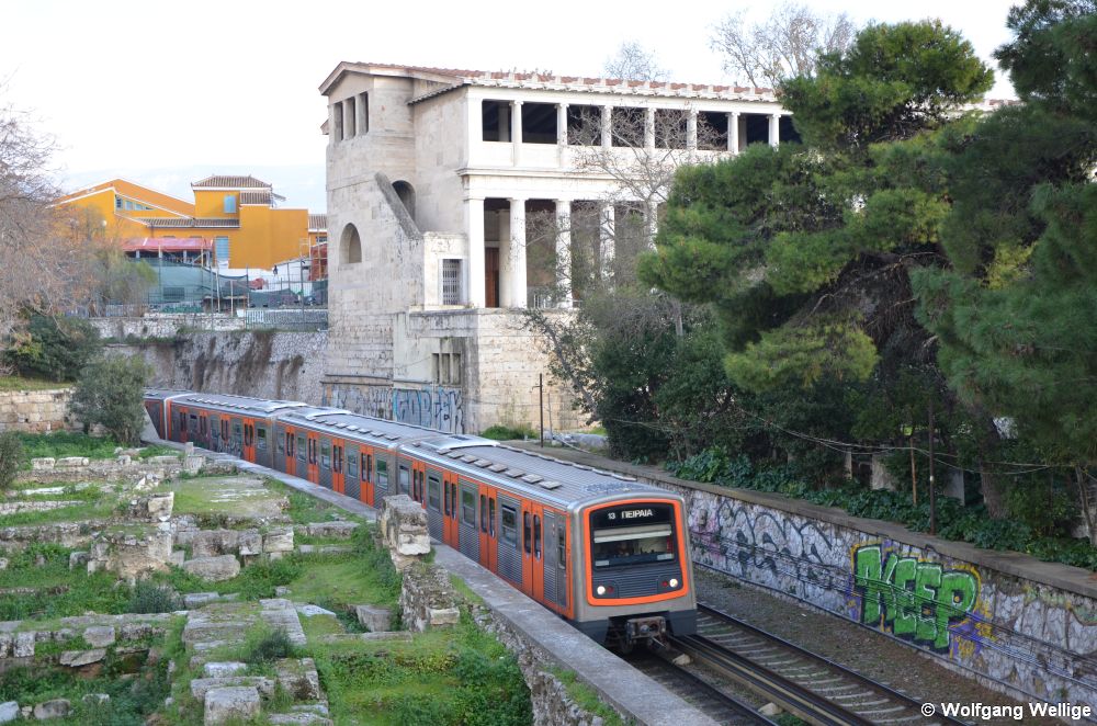 Antike Bauten oder Überreste davon finden sich zahlreich in Athen. Zwischen den Stationen Monastiraki (Μοναστηράκι) und Thissio (Θησείο) fährt die Metro sogar direkt daran vorbei: Am 23.01.2016 passiert Wagen 3153 als Linie 1 nach Piräus diesen Abschnitt.