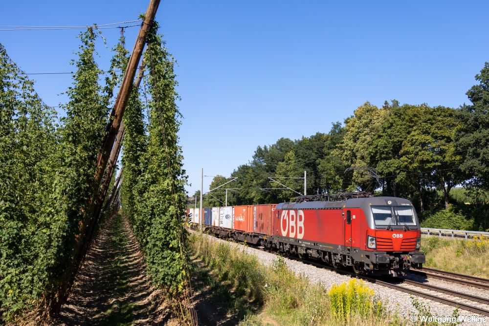 Die von Siemens gebaute 'Vectron'-Lok 1293 034 der ÖBB rollt am 19. Juli 2022 mit einem Zug des Kombinierten Ladungsverkehrs an einem Hopfenfeld bei Rohrbach (Ilm) zwischen Ingolstadt und München entlang.