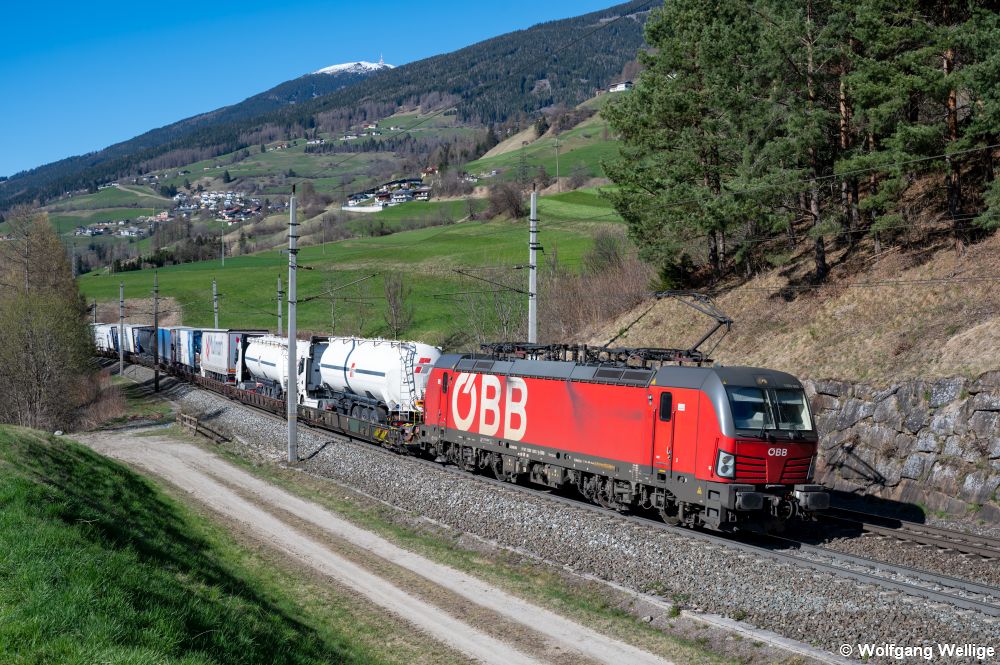 1293 028 zieht die 'Rollende Landstraße' (ROLA) 53441 von Wörgl zum Brenner am 4. April 2025 die Brenner-Nordrampe hinauf, aufgenommen bei Matrei.