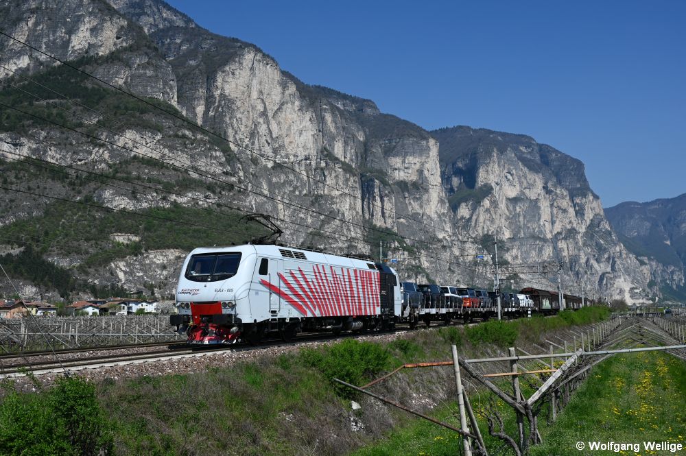 Die Rail Traction Company (RTC) ist das italienische Partnerunternehmen von Lokomotion, wie an der Lackierung deutlich erkennbar ist. Am 5. April 2025 fährt die nur für den Verkehr innerhalb Italiens geeignete Lok EU43 005 gleich durch Mezzocorona.