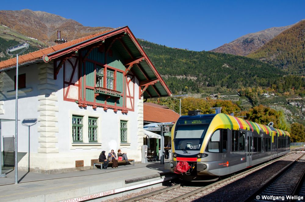 ATR 100 001 der von der Südtiroler SAD betriebenen Vinschgerbahn hält am 30.Oktober 2011 als R 111 von Meran nach Mals im fotogenen Bahnhof Schlanders