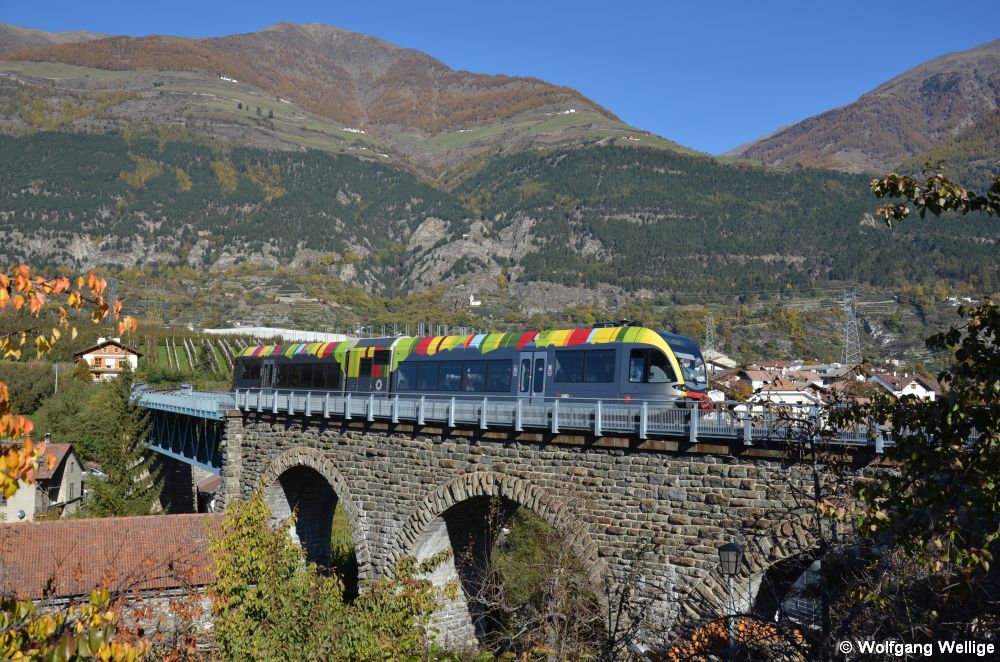 Der von Stadler gebaute GTW 2/6-Dieseltriebwagen Nummer ATR 100 011 der SAD am 30.10.2011 als R 112 von Mals nach Meran auf dem Viadukt in Schlanders