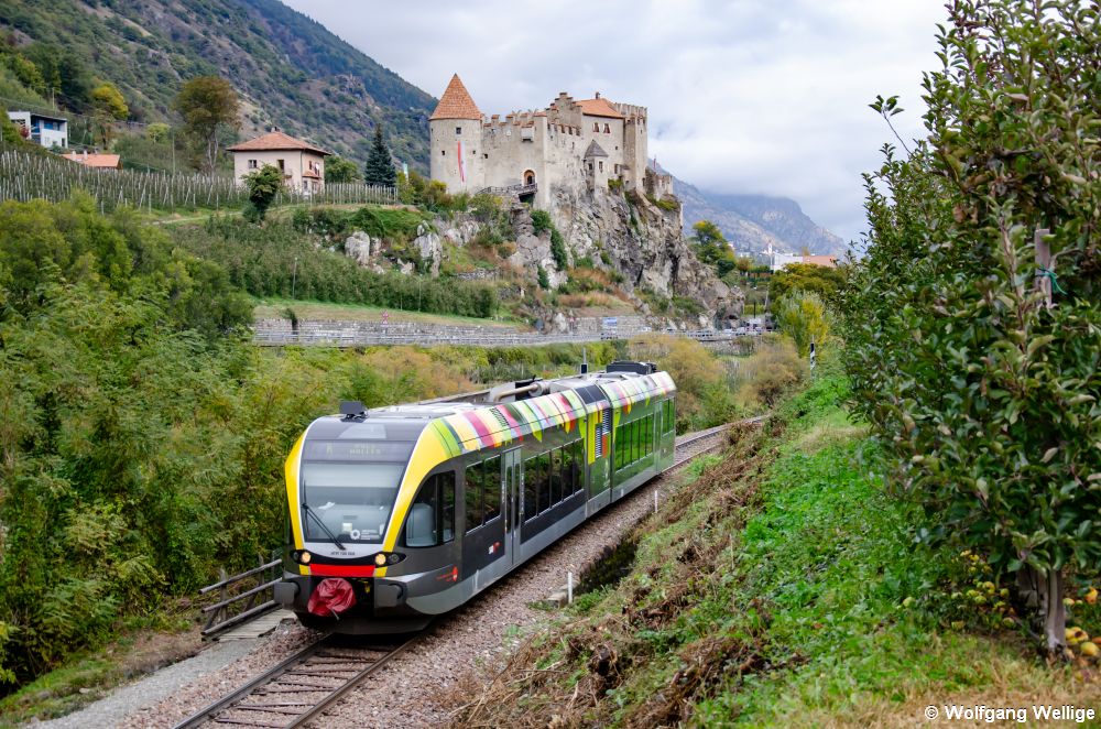 ATR 100 009 der SAD verlässt am 26. Oktober 2011 auf der Fahrt von Meran nach Mals den Ort Kastelbell, hinter dem Zug ist das gleichnamige Schloss zu erkennen