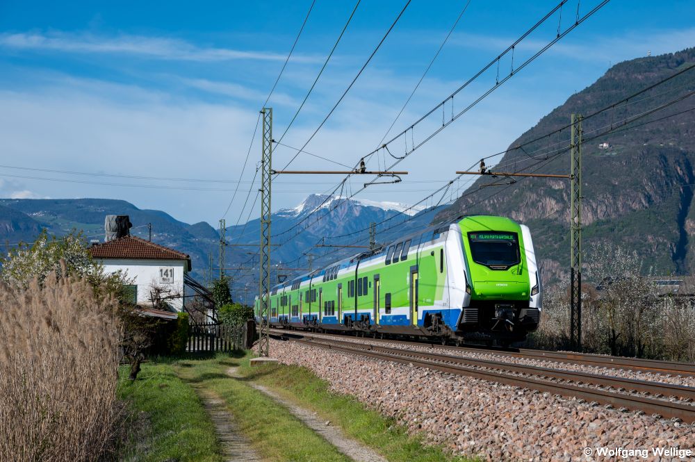 Der Doppelstock-Triebzug 521 052 vom Typ Hitachi Caravaggio des Betreibers Trenord passiert am 5. April 2025 als R 2697 von Bolzano/Bozen nach Milano Porta Garibaldi ein altes Bahnwärterhäuschen bei Bronzolo/Branzoll in Südtirol